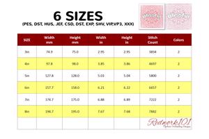 The .ZIP file will contain the following formats: .PES, .CSD, .DST, .EXP, .HUS, .JEF, .SHV, .VIP, .XXX, .VP3, .PEC