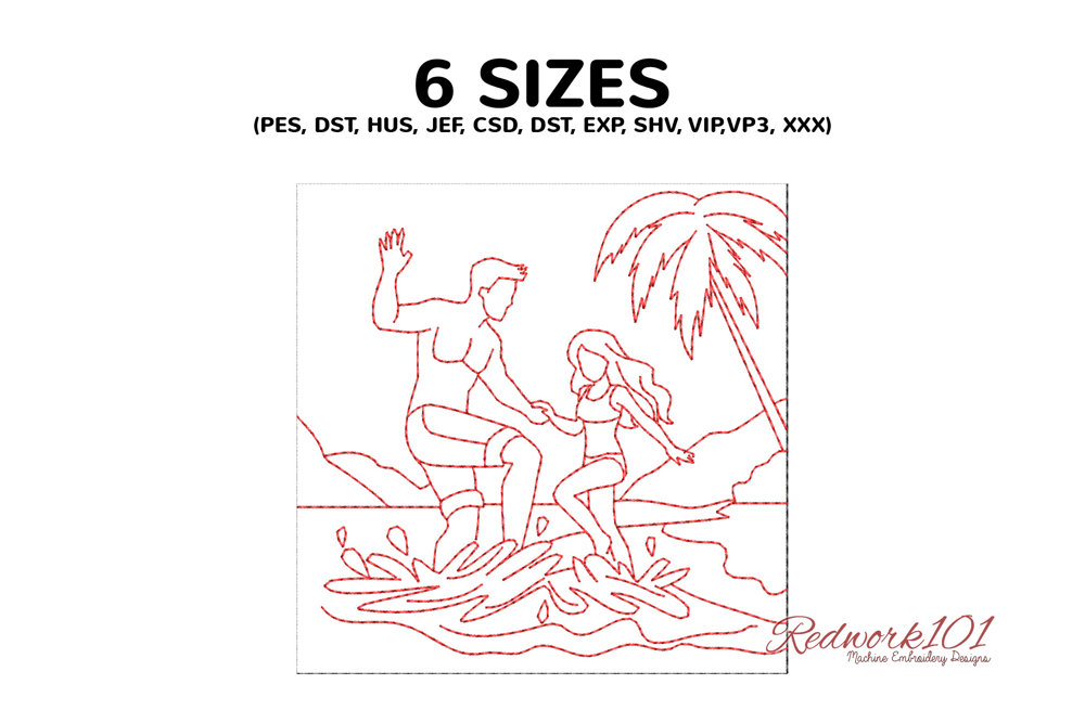 A couple is shown playing and splashing in the shallow waves of a beach with a palm tree in the background.