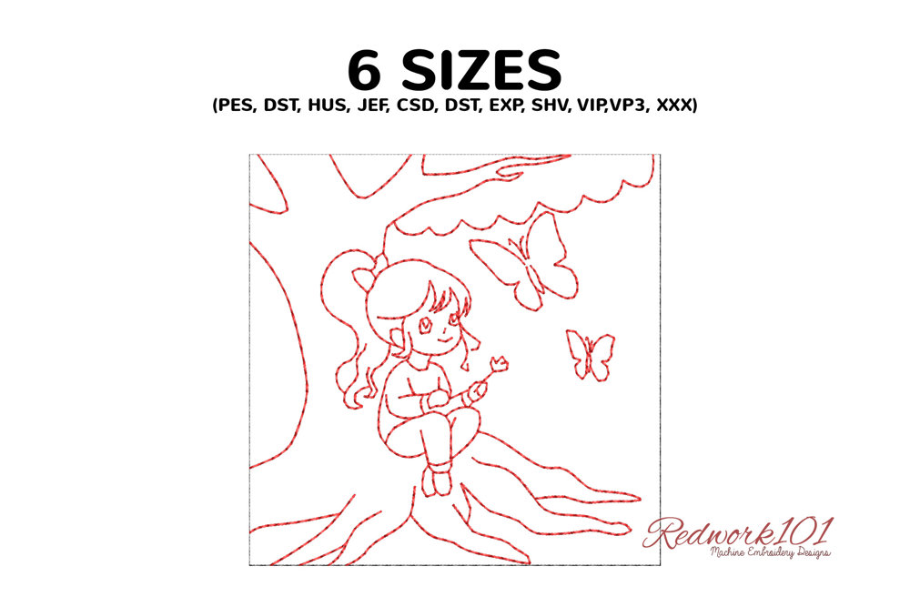 A young girl is depicted sitting on the branches of a large tree, with butterflies flying around her.