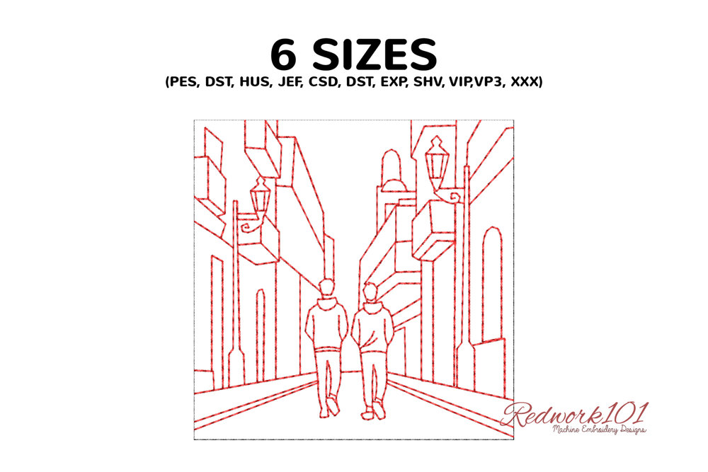 Two figures are shown from behind, walking away down a street or alleyway lined with buildings and lampposts.