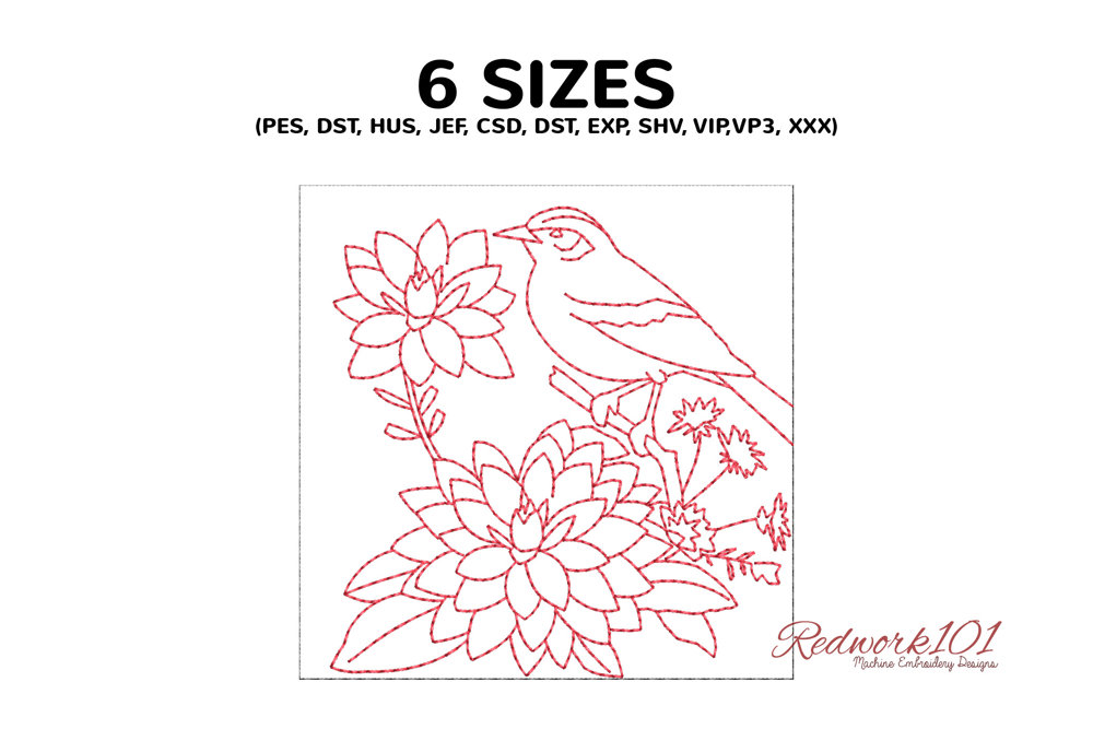 A simple representation of a skylark bird perched on a branch next to blooming dahlia flowers.