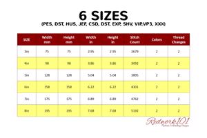 The .ZIP file will contain the following formats: .PES, .CSD, .DST, .EXP, .HUS, .JEF, .SHV, .VIP, .XXX, .VP3, .PEC