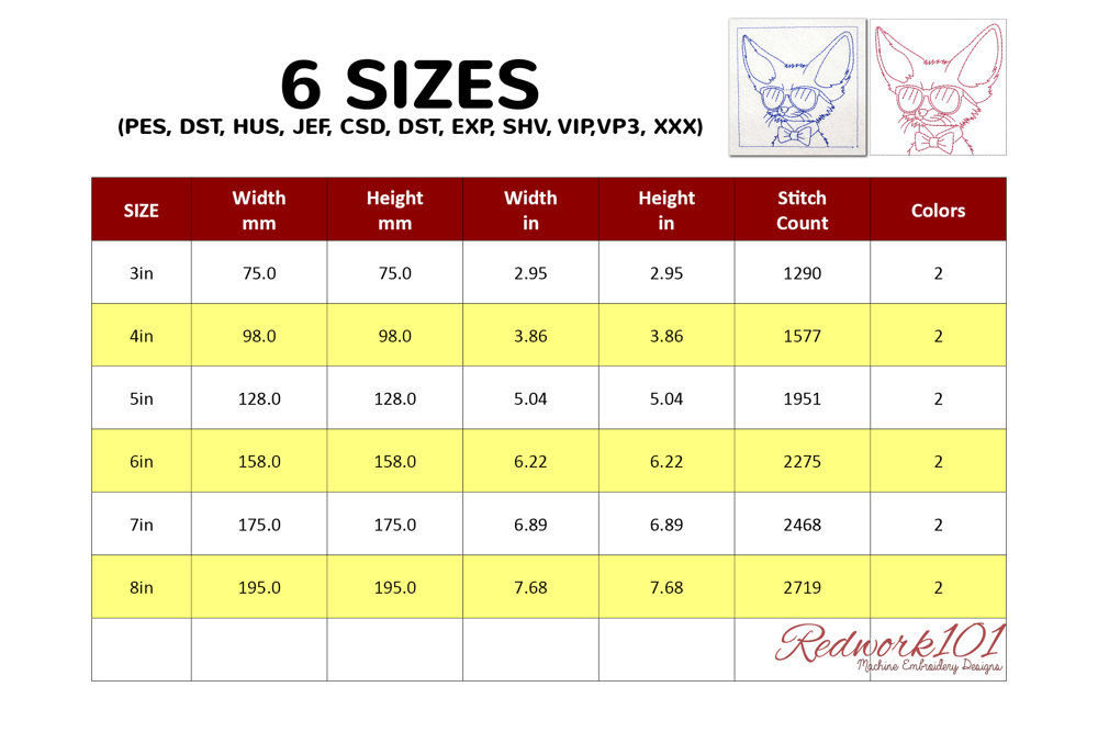 The .ZIP file will contain the following formats: .PES, .CSD, .DST, .EXP, .HUS, .JEF, .SHV, .VIP, .XXX, .VP3, .PEC