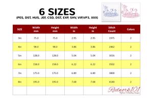 The .ZIP file will contain the following formats: .PES, .CSD, .DST, .EXP, .HUS, .JEF, .SHV, .VIP, .XXX, .VP3, .PEC