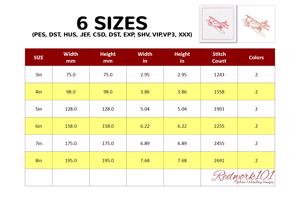 The .ZIP file will contain the following formats: .PES, .CSD, .DST, .EXP, .HUS, .JEF, .SHV, .VIP, .XXX, .VP3, .PEC