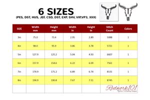The .ZIP file will contain the following formats: .PES, .CSD, .DST, .EXP, .HUS, .JEF, .SHV, .VIP, .XXX, .VP3, .PEC