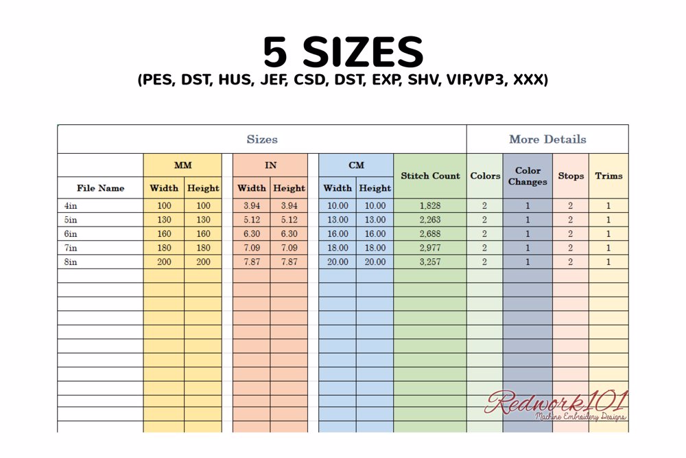 The .ZIP file will contain the following formats: .PES, .CSD, .DST, .EXP, .HUS, .JEF, .SHV, .VIP, .XXX, .VP3, .PEC