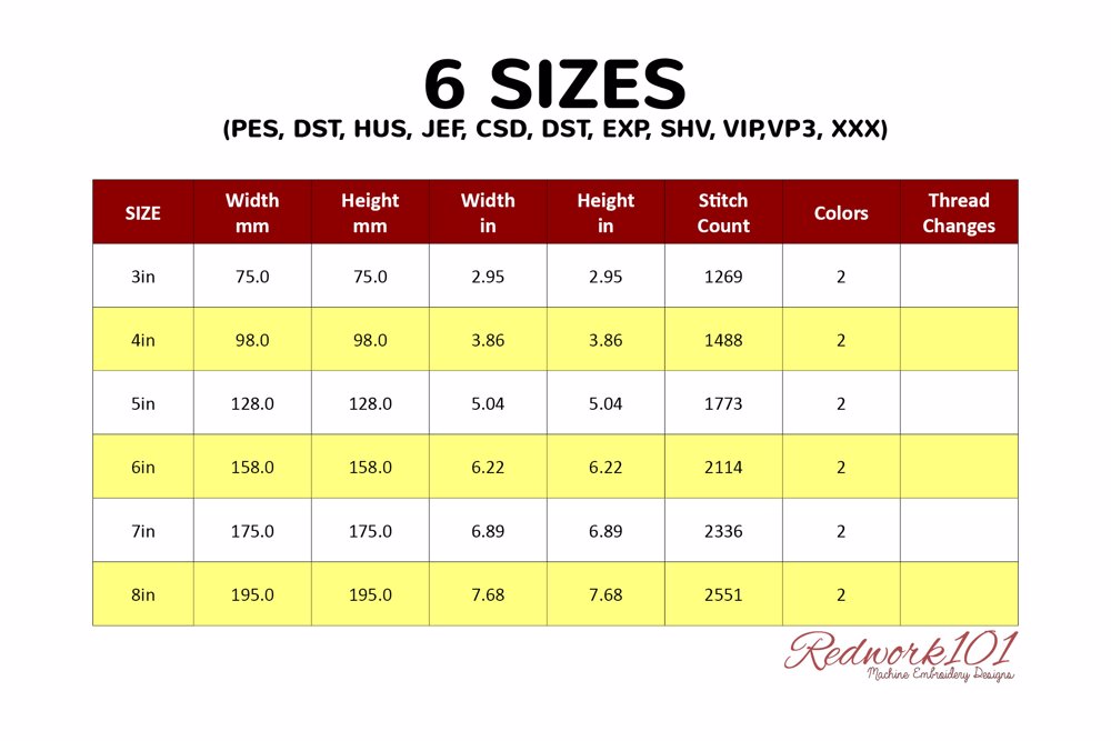 The .ZIP file will contain the following formats: .PES, .CSD, .DST, .EXP, .HUS, .JEF, .SHV, .VIP, .XXX, .VP3, .PEC
