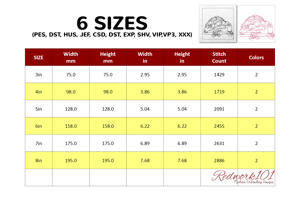 The .ZIP file will contain the following formats: .PES, .CSD, .DST, .EXP, .HUS, .JEF, .SHV, .VIP, .XXX, .VP3, .PEC