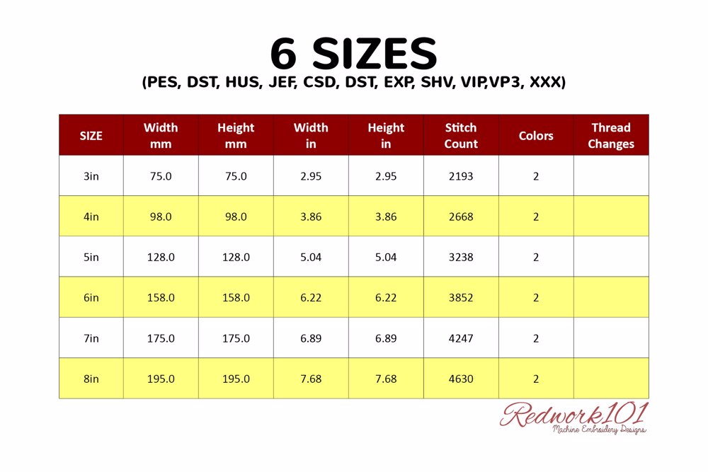 The .ZIP file will contain the following formats: .PES, .CSD, .DST, .EXP, .HUS, .JEF, .SHV, .VIP, .XXX, .VP3, .PEC