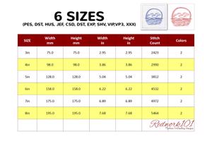 The .ZIP file will contain the following formats: .PES, .CSD, .DST, .EXP, .HUS, .JEF, .SHV, .VIP, .XXX, .VP3, .PEC