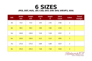 The .ZIP file will contain the following formats: .PES, .CSD, .DST, .EXP, .HUS, .JEF, .SHV, .VIP, .XXX, .VP3, .PEC