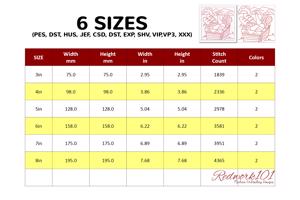 The .ZIP file will contain the following formats: .PES, .CSD, .DST, .EXP, .HUS, .JEF, .SHV, .VIP, .XXX, .VP3, .PEC