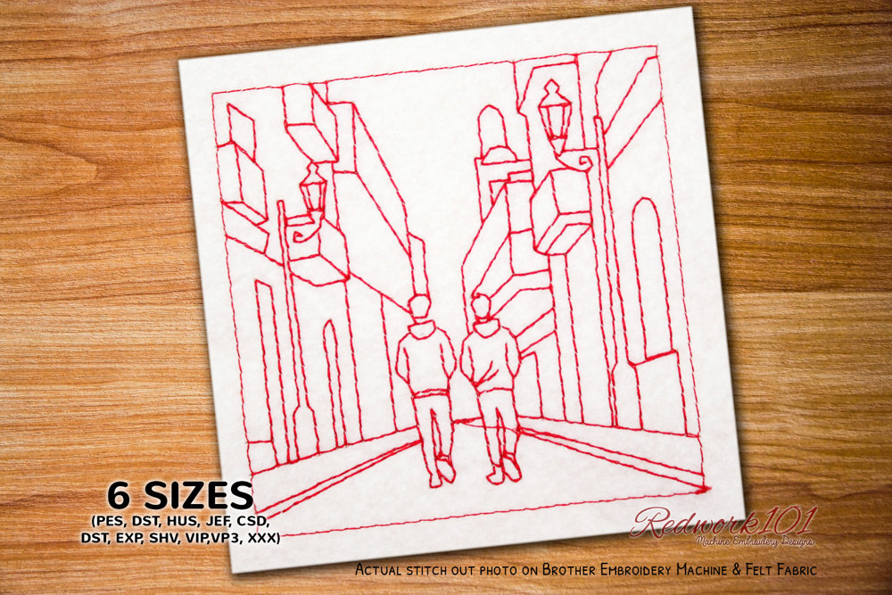 Two figures are shown from behind, walking away down a street or alleyway lined with buildings and lampposts.