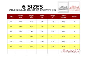 The .ZIP file will contain the following formats: .PES, .CSD, .DST, .EXP, .HUS, .JEF, .SHV, .VIP, .XXX, .VP3, .PEC