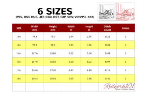The .ZIP file will contain the following formats: .PES, .CSD, .DST, .EXP, .HUS, .JEF, .SHV, .VIP, .XXX, .VP3, .PEC