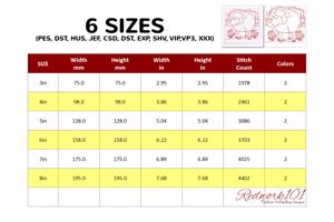 The .ZIP file will contain the following formats: .PES, .CSD, .DST, .EXP, .HUS, .JEF, .SHV, .VIP, .XXX, .VP3, .PEC