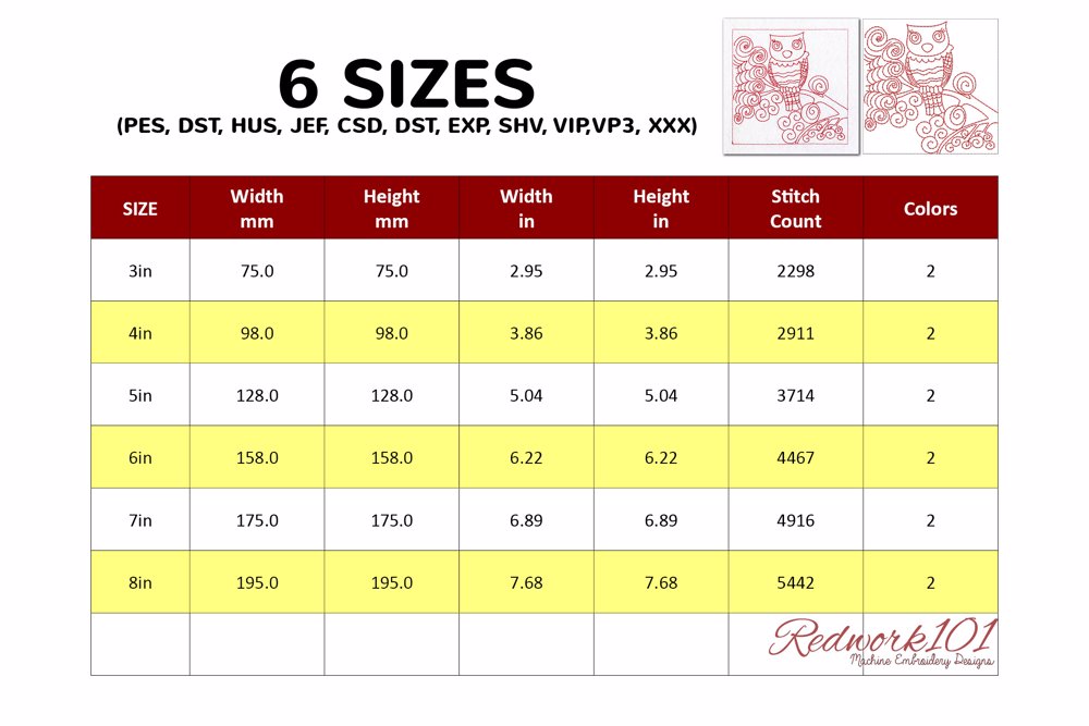 The .ZIP file will contain the following formats: .PES, .CSD, .DST, .EXP, .HUS, .JEF, .SHV, .VIP, .XXX, .VP3, .PEC