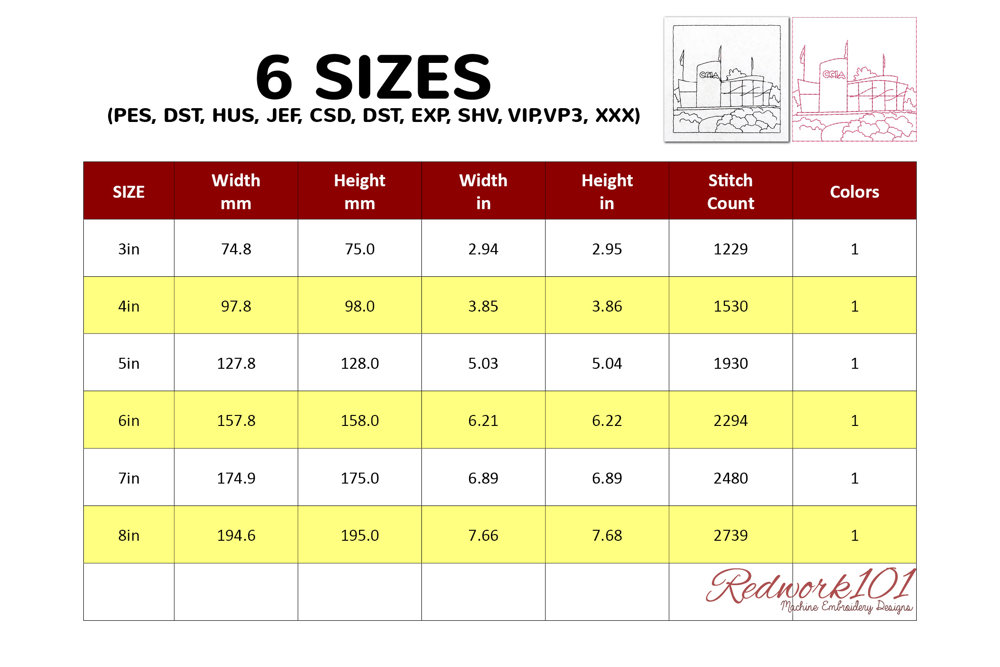 The .ZIP file will contain the following formats: .PES, .CSD, .DST, .EXP, .HUS, .JEF, .SHV, .VIP, .XXX, .VP3, .PEC